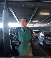 过了一会儿,穿绿衣的女子对Chew说,在那边有一个空车位,示意他去那边停车。Chew说,好啊你走过去然后让你爸爸去那边停车就好了,我已经在这边等着这个车位了。