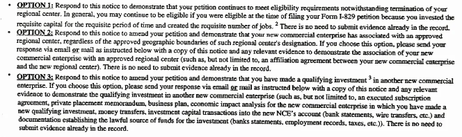 需要注意的是,移民局规定,投资人在收到该通知书183天以内 (如果居住在美国境外,则194天内) 采取以下三个选项之一回复移民局,否则移民局会默认投资人选择了选项1来推进申请。