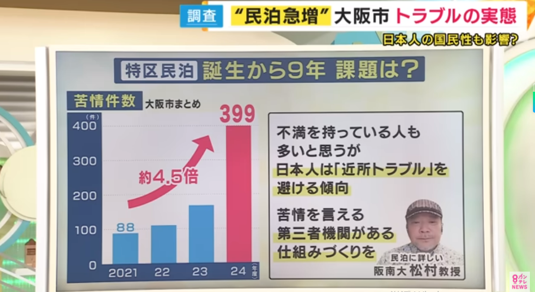 深夜噪音、垃圾乱丢、陌生人频繁进出,成为困扰居民日常生活的“三件套”。2021年大阪市民宿相关投诉为88件,2024年跃升至399件,投诉量4年翻4.5倍。以至于大阪市不得不成立了一个项目小组来讨论如何处理。