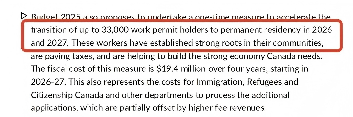 作为新计划的一大亮点,加拿大政府宣布将在2026-2027年间为3.3万名工签持有者提供直接转为永久居民的通道。并且这一措施独立于主要的永久居民目标之外。
