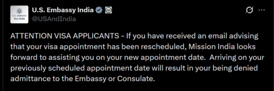 “签证申请人请注意——如果您已收到电子邮件通知您的签证预约已重新安排,印度使领馆期待在新的预约日期为您提供帮助。如果您在之前预约的日期到达使领馆,将被拒绝进入。”