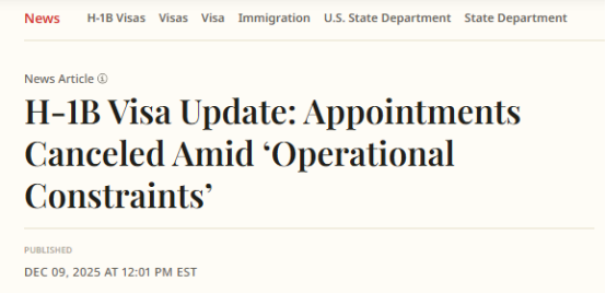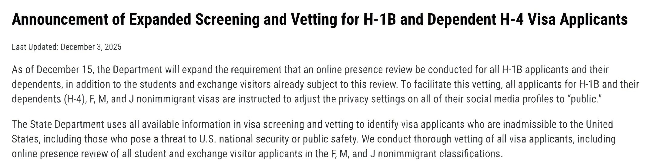最早披露此消息的业内人士指出,此次行动属于“临时、突然、批量”性质,大概率与美国国务院从2025年12月15日起对全球H-1B/H-4申请实施新的社交媒体审查政策密切相关。