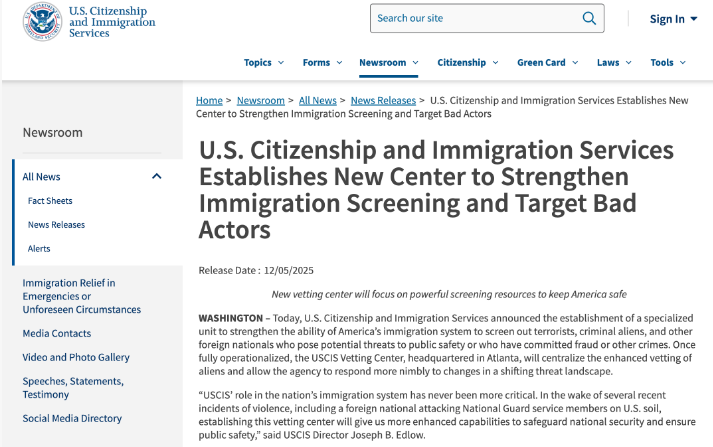 当地时间12月5日,美国公民及移民服务局(USCIS)宣布将在亚特兰大成立全新的“审查中心”,专门处理移民身份与申请背景的深度核查工作。
