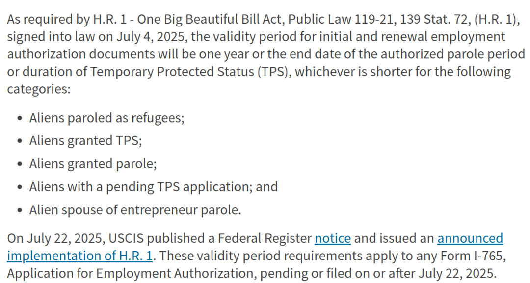 *有效期计算方式:“1年有效期 ”或 “假释/TPS授权期限到期日 ”两者中取其较短者。上述规则早在2025年7月22日联邦公报刊登公告时即已生效,适用于所有2025年7月22日及之后递交或审理中的I-765。