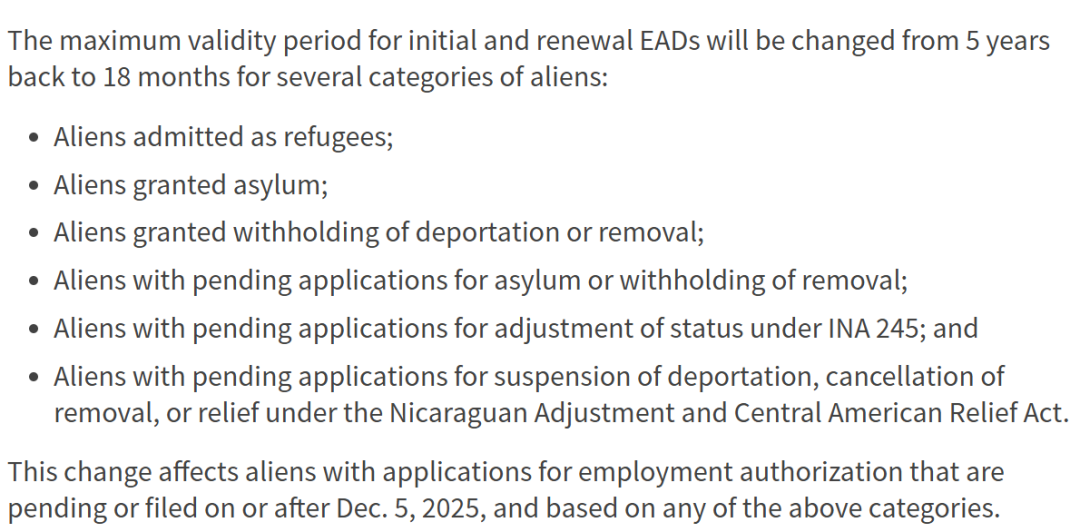 新规于2025年12月5日起正式生效。即该日起新递交或12月5日仍在待审的所有I-765申请都将只有18个月有效期。