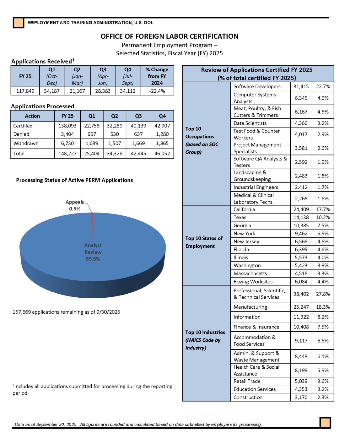 2025财年PERM劳工证申请总量:117,849 份,同比下降22.4%;