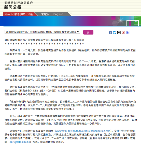 香港于2024年12月底承诺实施加密资产申报框架,香港政府计划2026年内完成所需的本地立法修订,目标是从2028年起与相关伙伴税务管辖区自动交换与加密资产交易相关的税务资料,以及由2029年起实施新修订的共同汇报标准。