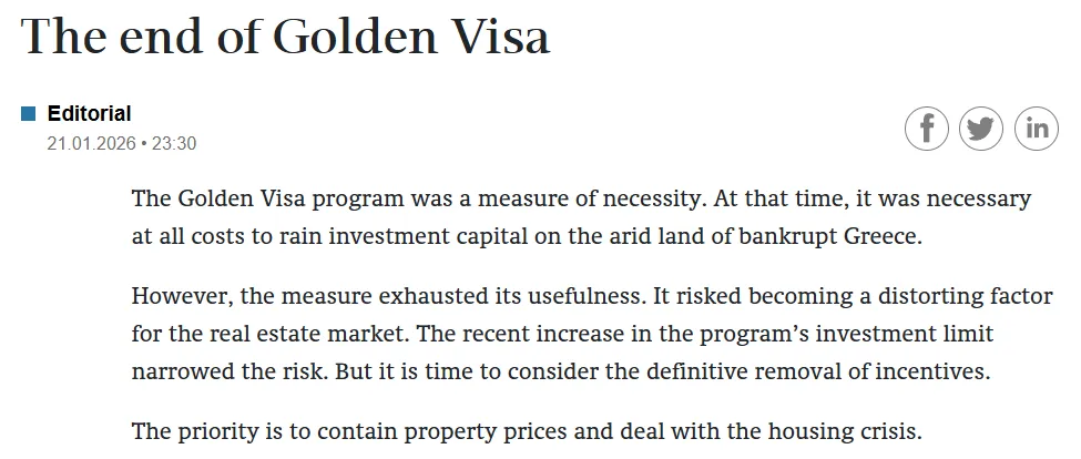 这篇题为 “The end of Golden Visa”的社论,直接将希腊黄金签证项目定义为 “一项出于必要性的措施”。