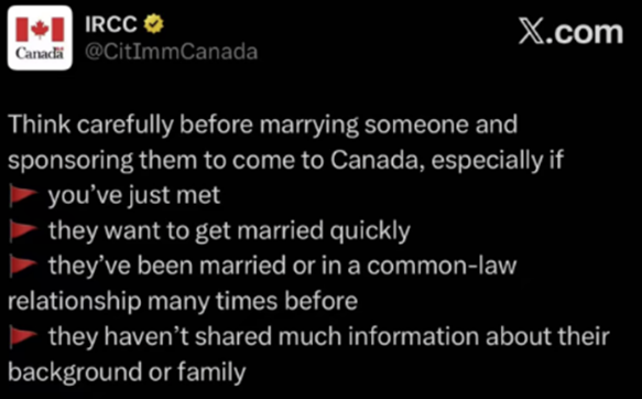 2026年1月,加拿大移民部在其官方X账号发布警示,直指 “婚姻欺诈”(Marriage Fraud)。移民官不再只关注结婚证的真伪,而是深入调查关系的真实性、是否涉及金钱交易等细节。一旦被认定为虚假婚姻,申请人可能面临5年禁止入境,担保人也会进入“高风险名单”,后续移民申请难度倍增。