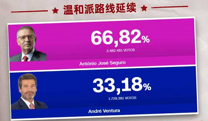 当地时间2026年2月8日选举结果出炉!中左翼社会党候选人安东尼奥・若泽・塞古罗(António José Seguro)以压倒性的优势取得胜利(得票率66.82%)。而极右翼(Chega)候选人安德烈・文图拉(André Ventura)落败(得票率33.18%)。
