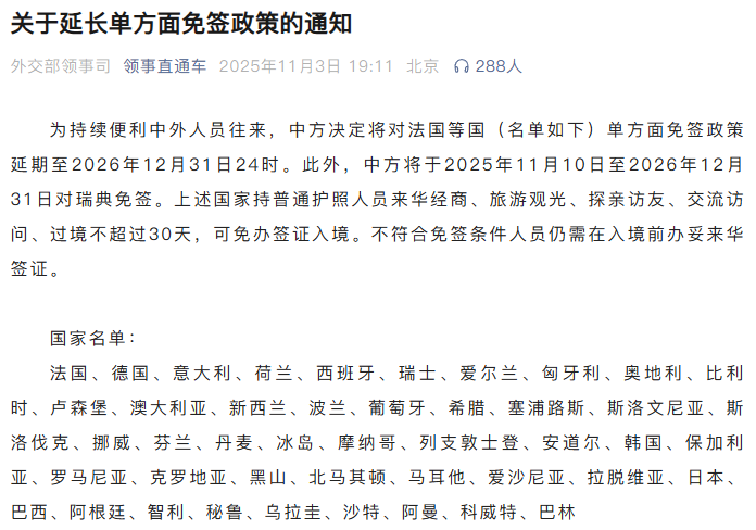 中方宣布对法国等国(名单如下)单方面免签政策延期至2026年12月31日24时