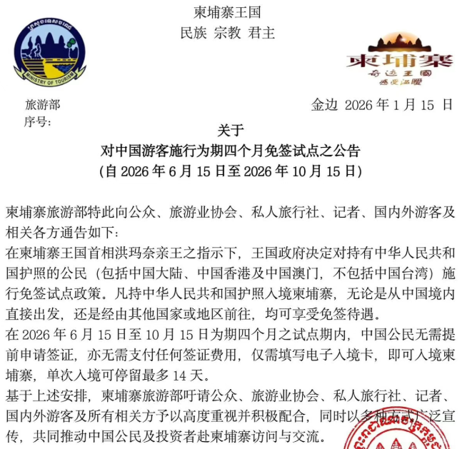 据柬埔寨政府官方文件显示,2026年6月15日至10月15日期间,将对中国公民试行免签证入境政策,持有效中国护照即可入境,每次停留最长可达14天,且允许不限次数往返。柬埔寨的免签政策虽然从今年6月才开始执行,不过目前也仅需落地签(停留30天)即可进入。