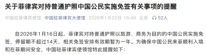 菲律宾外交部1月15日宣布,自2026年1月16日起,中国公民可免签入境菲律宾,停留时间最长为14天。该政策仅适用于经马尼拉和宿务机场入境的游客,且14天的停留期限不可延长。