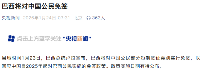 1、巴西——将对中国公民持部分短期签证实行免签