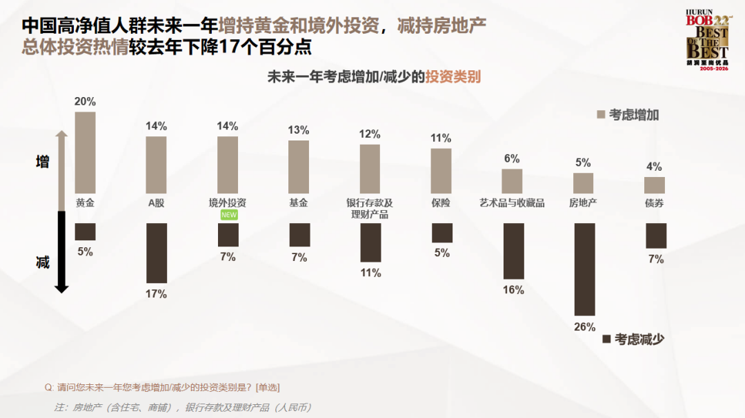 2026年1月30日,胡润研究院发布了《2026胡润至尚优品——中国高净值人群品质生活报告》,采访了470位千万资产的中国高净值人士。结果显示——未来一年,高净值人群的投资方向是:增持黄金、境外投资、基金和保险,减持房地产。