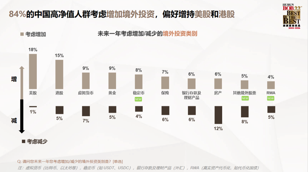 更值得关注的是,尽管全球市场波动加剧,他们的境外投资意愿并未消退,反而更趋集中。数据显示,84%的受访高净值人群考虑境外投资,其中年轻人热情更高。